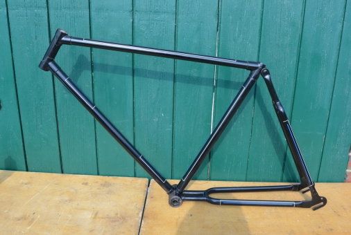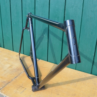 Dieser Rahmen wurde von Jahrzehnten abgestrahlt, neu lackiert, handliniert aber nie aufgebaut. Ein paar lagerungsbedingte, kleine Kratzer können vorhanden sein. Ansonsten aber eine unschlagbar günstige Möglichkeit, einen bereits aufgearbeiteten, frühen Rahmen zu neuem Leben zu erwecken!