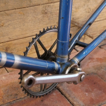 Fahrradrahmen RÖHN für Sportrad, Herren, 26 Zoll, Stahl, 50er J., blau/silber, Linien weiß, Rahmenhöhe 55 cm, Einbaumaß 109 mm, Thompson-Lager Kettenblatt 46 Zähne, Rahmen-Nr. 124XXX, gebraucht mit schöner Patina, Zustand gemäß Fotos