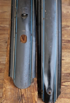 Schutzbleche Satz, 26 Zoll, Herrenausführung für Tourenrad, 30er-50er J., schwarz, Linien blau/weiß, Breite ca. 60 mm, gebraucht mit schöner Patina, Originallack, Zustand gemäß Fotos.