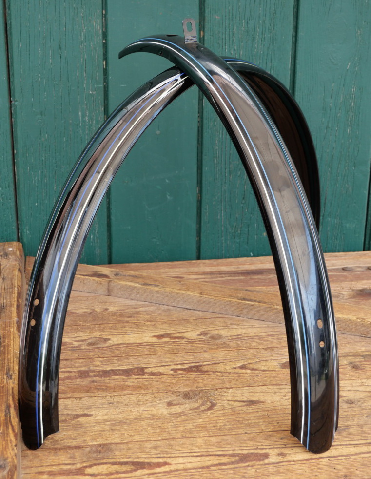 Schutzbleche Satz, 28 Zoll, Herrenausführung, 30er-50er J., schwarz, Linien blau/weiß, Breite ca. 60 mm,