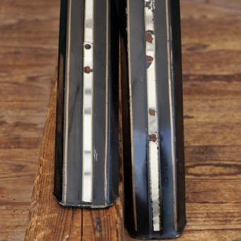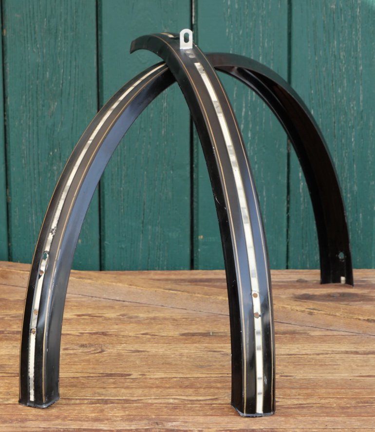 Schutzbleche Satz, 28 Zoll, Herrenausführung für Tourenrad, 60er/70er J., schwarz, Linien gold, Mitte weiß geflammt, Breite ca. 54 mm, gebraucht mit schöner Patina, Originallack, Zustand gemäß Fotos.