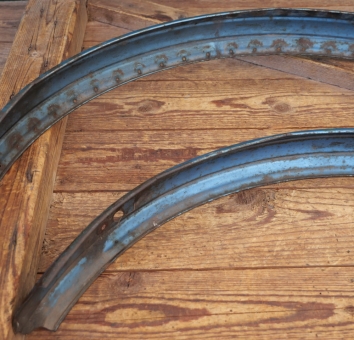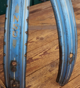 Schutzbleche Satz NSU, 26 Zoll, Damenausführung, 50er J., blau-metallic, Linien weiß/gold, Breite 60 mm, gebraucht zum restaurieren: Befestigungslöcher ausgerissen, fünf kleine, seiltliche Risse, Zustand gemäß Fotos.
