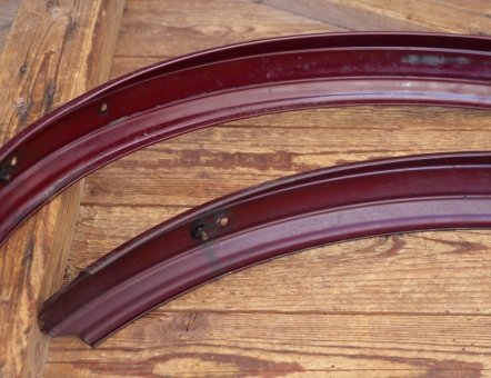 Schutzbleche Satz NSU, 26 Zoll, Herrenausführung, 40er/50er J., weinrot, Linien gold, Breite 60 mm, gebraucht mit sehr schöner Patina, Zustand gemäß Fotos.
