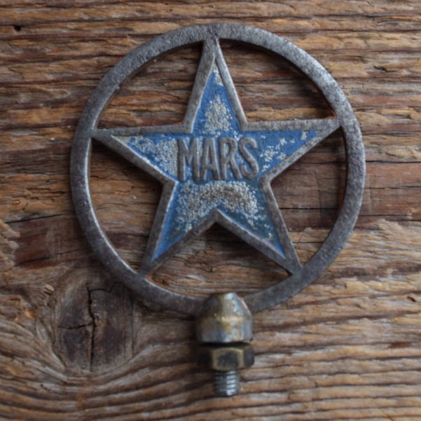 Schutzblechfigur MARS, Eisen verchromt, orig. Altbestand 30er Jahre, Zustand siehe Bild Passend zum entsprechenden Fahrrad oder schönes Sammlerstück für die Vitrine! Wir haben immer einige Hundert Schutzblechfiguren für Fahrräder und frühe Mopeds am La