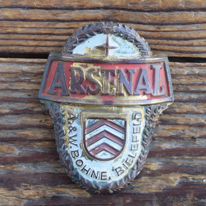Schutzblechwappen für hinten ARSENAL, 50er Jahre, Originalwappen aus Sammlungsbestand Ideal für den passenden Fahrradoldtimer oder die Sammlervitrine. Zustand siehe Bild.