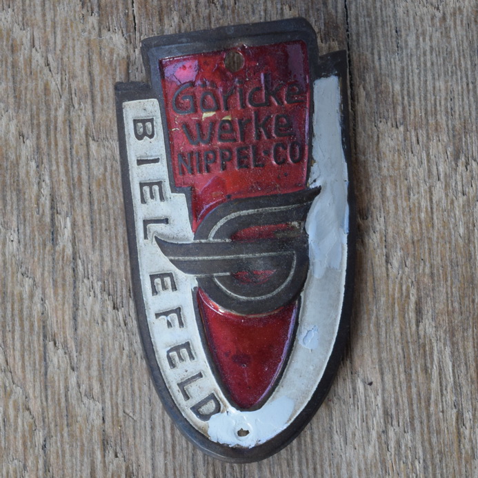 Steuerkopfschild GÖRICKE WERKE, 50er Jahre, Originalschild aus Sammlungsbestand, Lochabstand 51 mm Ideal für den passenden Fahrradoldtimer oder die Sammlervitrine. Zustand siehe Bild.