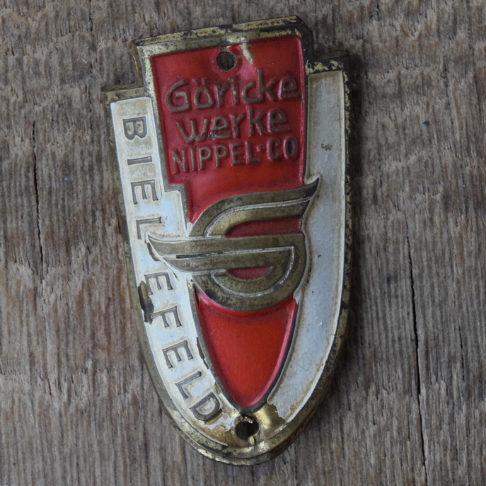 Steuerkopfschild GÖRICKEWERKE, 50er Jahre, Originalschild aus Sammlungsbestand, Lochabstand 50 mm Ideal für den passenden Fahrradoldtimer oder die Sammlervitrine. Zustand siehe Bild.