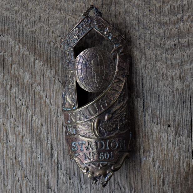 Steuerkopfschild NAUMANN, 30er Jahre, Originalschild aus Sammlungsbestand, unteres Loch aufgerissen, Lochabstand 74 mm