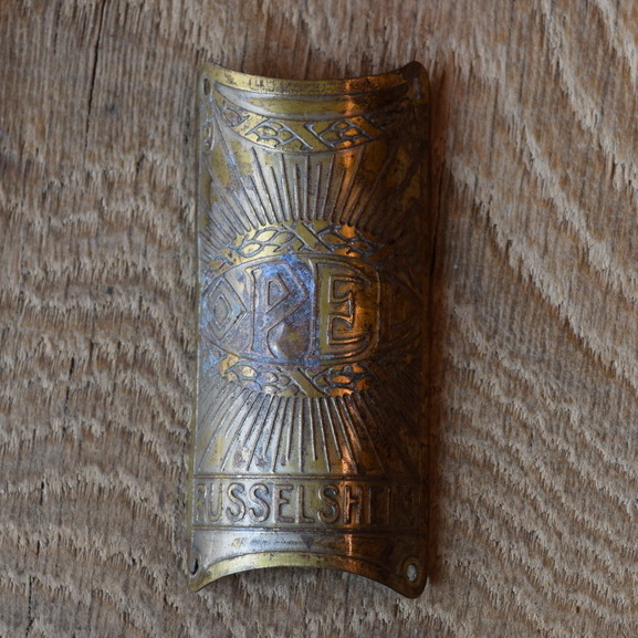 Steuerkopfschild Opel Rüsselsheim, 30er Jahre, Originalschild aus Sammlungsbestand , Lochabstand 67 mm längs, 31 mm quer (Vierlochschild)
