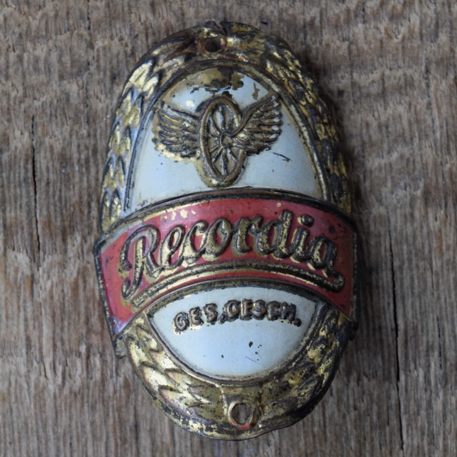 Steuerkopfschild RECORDIA, 50er Jahre, Originalschild aus Sammlungsbestand, Lochabstand 54 mm