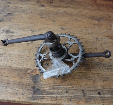 Tretlager "5/8 Zoll" Glockenausf., orig. 20er Jahre, verchromt, gebraucht mit alterstypischen Gebrauchsspuren, siehe Bilder. Staubkappe links lose, liegt anbei, Achslänge: 135 mm, Kurbellänge: 168 mm.