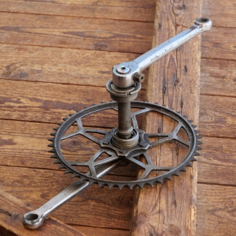 Tretlager RIXE für Sport-/Rennrad, orig. 30er-50er J., verchromt, Keillager, Kettenblatt 48 Zähne, Kurbellänge 175 mm, inkl. komplettem BSA-Lager, gebraucht mit Patina, Zustand siehe Bilder.