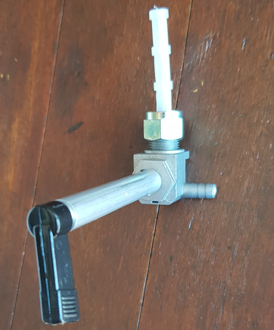Benzinhahn M12 x 1 links, Abgang rechts , Stutzen 6mm, mit Reserve, Hebellänge 65 mm (verstiftet und leicht einkürzbar). Gut einsetzbar bei Mopeds mit Blechverkleidungen, bei denen der Hahn von außen zugänglich ist.