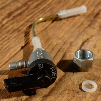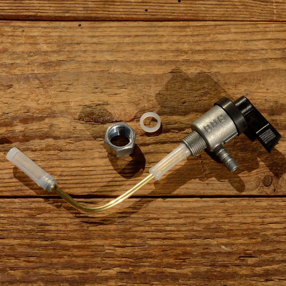 Benzinhahn "OMG", tankseitig M12x1 links, Abgang 6mm Schlauchstutzen, mit Reserve, u.a. passend für PUCH Maxi