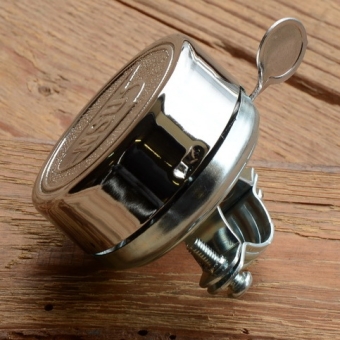 Glocke "NSU", verchromt, Nachfertigung, 56mm, neu aufgelegt im alten Design der 50/60er Jahre. Passend für NSU Fahrräder und Quickly`s