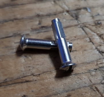 Speichennippel 1.8 mm, D-Schaft=3,8mm, L=18mm, Messing vernickelt, alte Ausführung mit flachem Linsenkopf, NOS. Passend zu den frühen Scheeren-, Altenburger- oder ähnlichen Aluminiumfelgen mit Holzkern. Diese Nippel sitzen optimal in den Schlauchreifenf