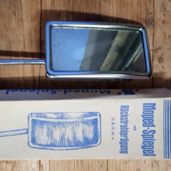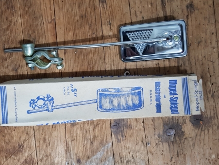 Spiegel Moped, PRAKTIKUS, orig. 50-60er Jahre, NOS, Rechts und Linksanbau möglich, verchromt mit Panoramaspiegel 85 x 45 mm (alterungsbed. etwas krisselig) im exzentrischen Kugelgelenk,