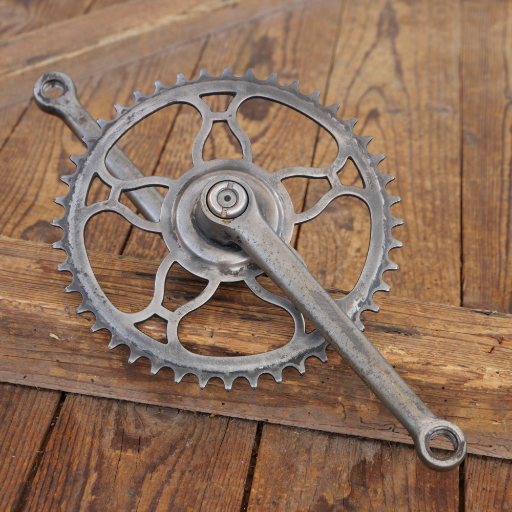 Tretlager HERCULES für Tourenrad, orig. 20er/30er Jahre, vernickelt, Glocken-Vierkant, Durchmesser Lagerschalen 40 mm, Kettenblatt 44 Zähne, Kurbellänge 165 mm, gebraucht mit schöner Patina, Zustand siehe Bilder.