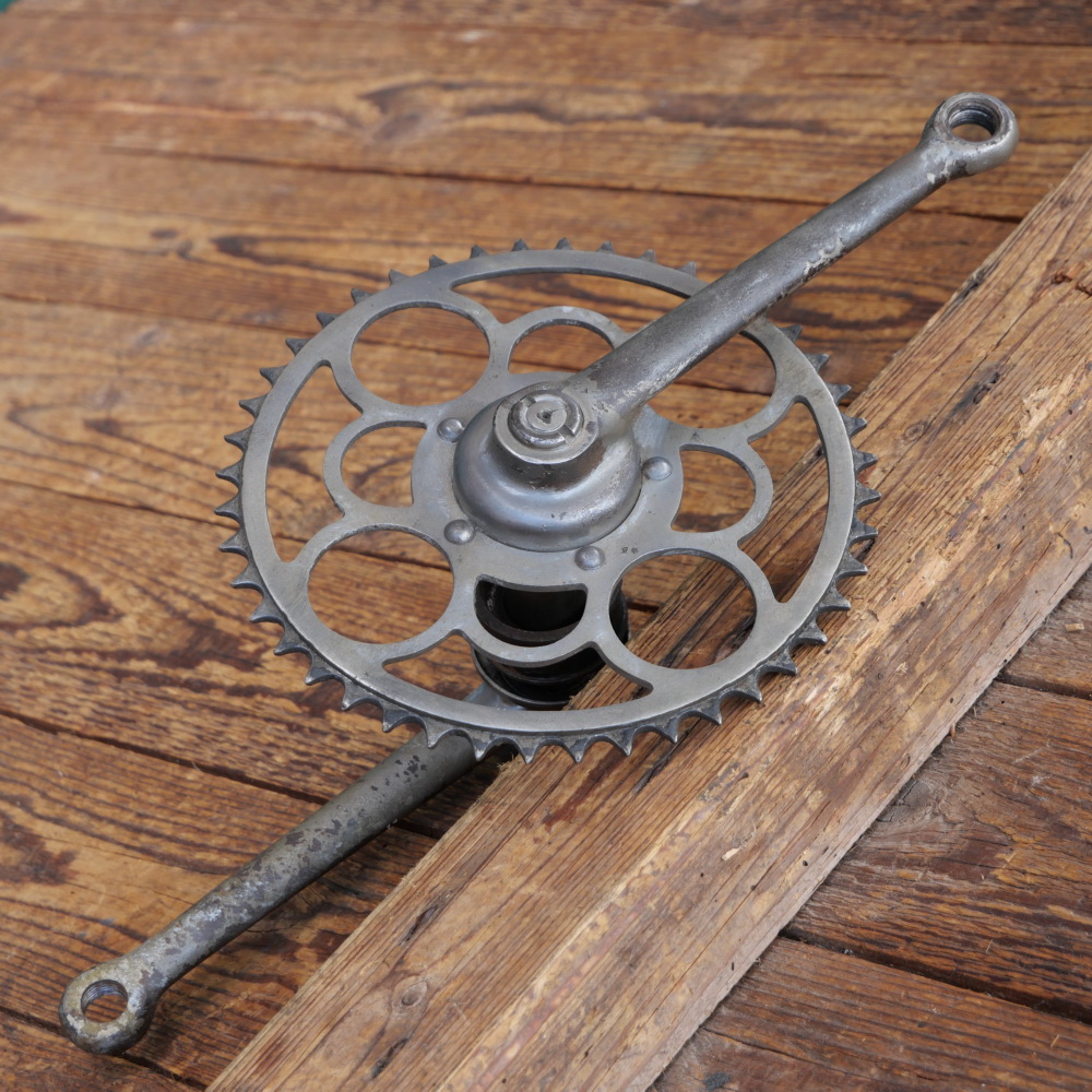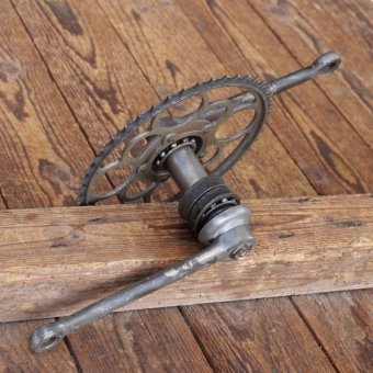 Tretlager NAUMANN Mod. 28a, orig. 20er Jahre, vernickelt, Glocken-Vierkant, Durchmesser Lagerschalen 42 mm, Kettenblatt 44 Zähne, Kurbellänge 165 mm, gebraucht mit Patina, Farbreste, Zustand siehe Bilder.