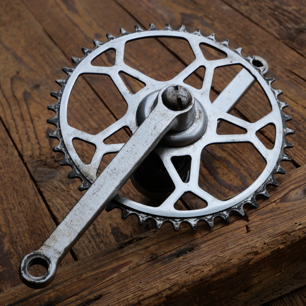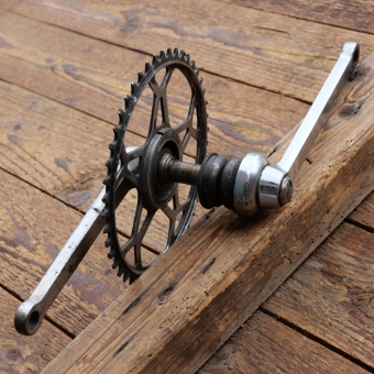 Tretlager universell für Tourenrad, orig. 30er-50er Jahre, verchromt, Glocken-Vierkant, Durchmesser Lagerschalen 40 mm, Kettenblatt 46 Zähne, Kurbellänge 170 mm, gebraucht mit schöner Patina, Zustand siehe Bilder.