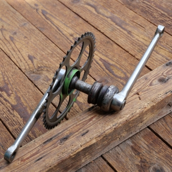Tretlager universell für Tourenrad, orig. 40er/50er Jahre, verchromt, Glocken-Vierkant, Durchmesser Lagerschalen 40 mm, Kettenblatt 46 Zähne, Kurbellänge 170 mm, gebraucht mit Patina, Zustand siehe Bilder.