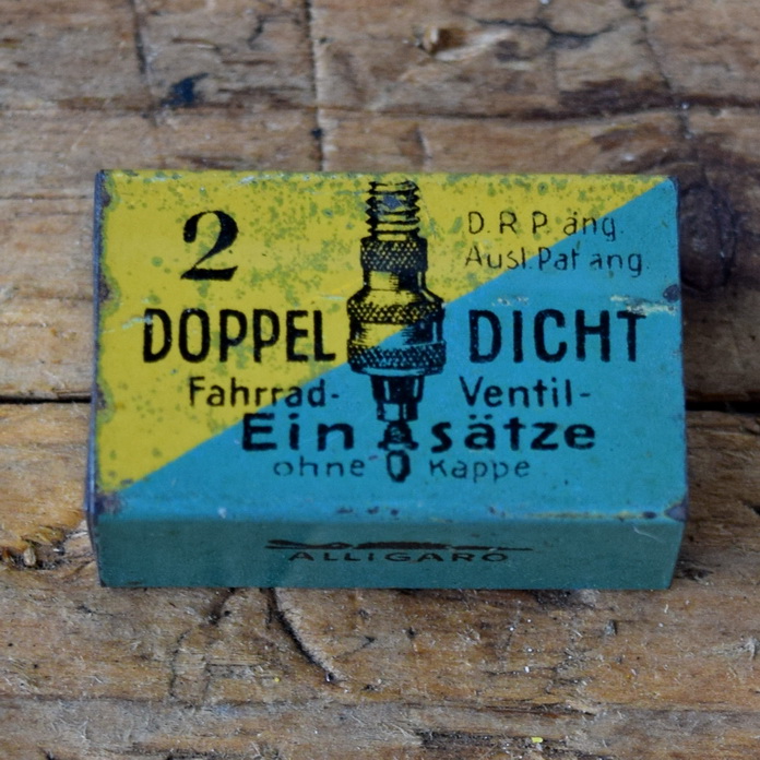 Blechdose "DOPPEL DICHT VENTILEINSÄTZE" orig. 30er Jahre, 33 x 21 x 12 mm, ohne Inhalt