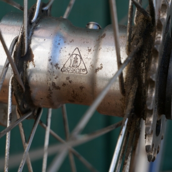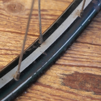 Hinterrad 28 Zoll (635) für Wulstbereifung, Ende 20er/Anfang 30er J., schwarz, Linien silber, Breite ca. 32mm, DÜRKOPP Freilaufbremsnabe, verchromt, Einbaumaße: ca. 109mm, 2mm Chrom-Speichen, gebraucht mit schöner Patina, Lager und Funktion gut, Zustan