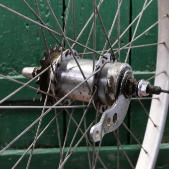 Hinterrad "Grünert", Alu, Kastenfelge für Drahtreifen, 26 Zoll (559), Breite ca. 28 mm, orig. 80er Jahre, Nabe "Shimano 3CC", inkl. Steckritzel 18 Zähne, Einbaumaß ca. 120 mm, 2mm Speichen verzinkt, mit deutlichen Gebrauchsspuren gemäß Fotos