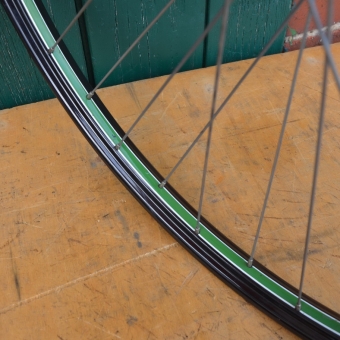 Laufrad 28 x 1,75, Nabe "Weco", Linierung grün/weiß, Felgenbreite 35 mm, Speichen verzinkt, Einbaumaß 95 mm