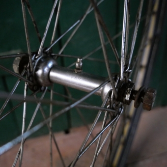Laufrad vorn 28 x 1,75 für Drahtbereifung, Linierung gelb/blau/weiss, 1930er-50er J.