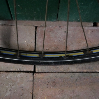 Laufrad vorn 28 x 1,75 für Drahtbereifung, Linierung gelb/blau/weiss, Breite ca. 37 mm, mit Patina, Einbaumaß ca. 92 mm