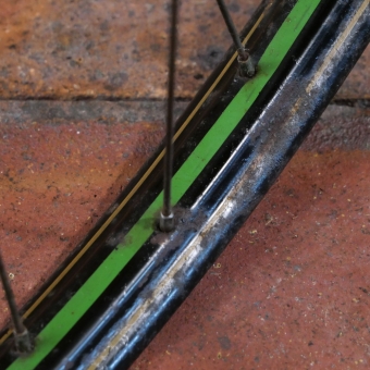 Vorderrad 28 Zoll (622), für Drahtbereifung, 50er Jahre, Felgenbreite ca. 36 mm, schwarz, Linierung grün/gold, Einbaumaß ca. 90, Nabe: UNION verchromt, Speichen 2 mm verzinkt, gebraucht mit Patina, technisch gut, Zustand gemäß Fotos