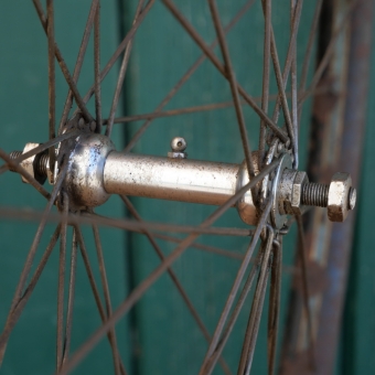 Vorderrad 28 Zoll (635) für Wulstbereifung, 30er J., schwarz, Linien blau/weiß, Breite ca. 32mm, F&S-Nabe, verchromt, Einbaumaße: ca. 91mm, 2mm Zink-Speichen, gebraucht, Lager o.k., Zustand gemäß Fotos