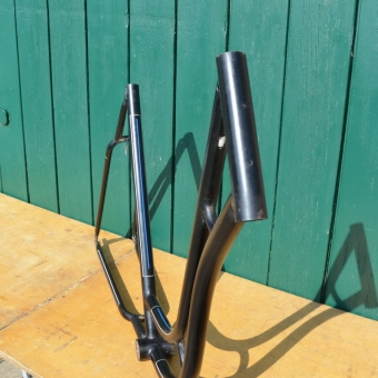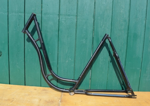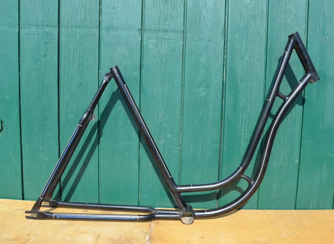 Dieser Rahmen wurde von Jahrzehnten abgestrahlt, neu lackiert, handliniert aber nie aufgebaut. Ein paar lagerungsbedingte, kleine Kratzer können vorhanden sein. Ansonsten aber eine unschlagbar günstige Möglichkeit, einen bereits aufgearbeiteten, frühen Rahmen zu neuem Leben zu erwecken!