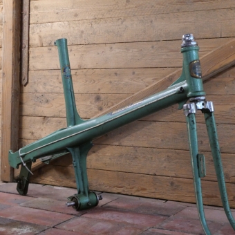 Fahrradrahmen HERCULES 2000, Design-Klassiker, 26 Zoll, Alu-Spritzguss, 50er J., lindgrün, Rahmenhöhe 53 cm, Einbaumaß ca. 113 mm, Keillager, Achslänge 138mm, Rahmennummer: 885XXX, gebraucht mit schöner Patina, Lager o.k., Zustand gemäß Fotos