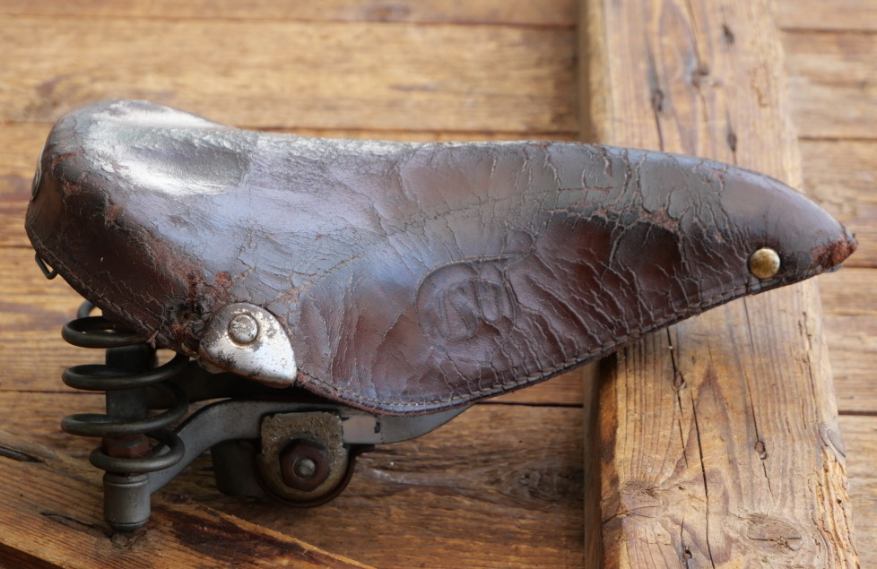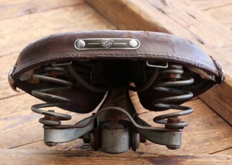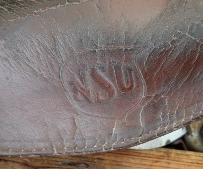 Sattel NSU, Herren, 50er/60er Jahre, Leder braun, Gestell verzinkt, Breite ca. 19 cm, Länge ca. 26 cm, gebraucht, Leder rissig, Niete rechts ausgerissen, daher nur Ausstellungsstück, Zustand gemäß Fotos