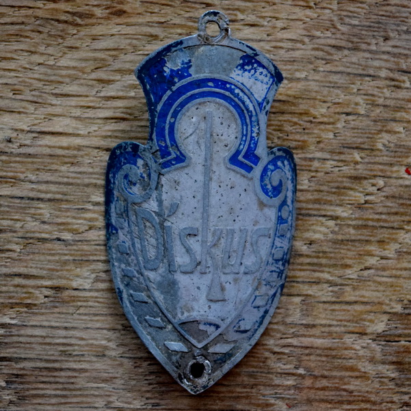 Steuerkopfschild DISKUS, 50er Jahre, Originalschild aus Sammlungsbestand, Lochabstand 57 mm Ideal für den passenden Fahrradoldtimer oder die Sammlervitrine. Zustand siehe Bild.