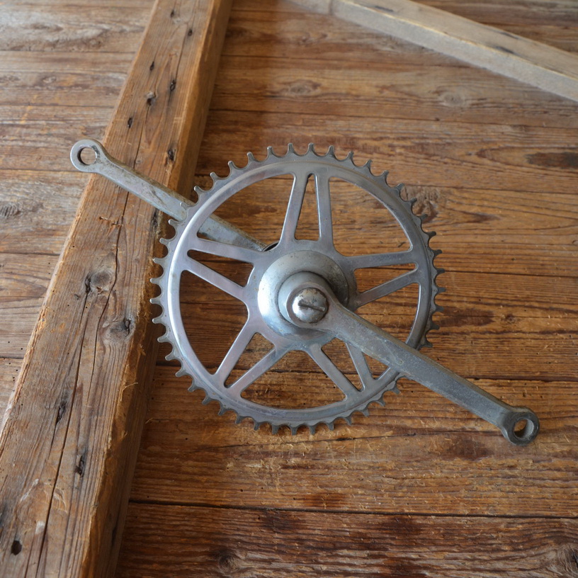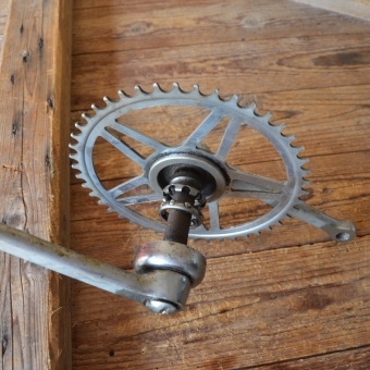 Tretlager Glockenausf. Achslänge 136 mm, Kurbellänge 170 mm, 60er Jahre. Hinweis zum Zustand: Die Tretlager sind unrestauriert, in der Substanz aber ok. Optik und Zustand der Zähne siehe Bilder. Die Konen und Lager müssen, soweit überhaupt dabei und je n
