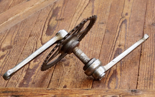 Tretlager NSU für Tourenrad, orig. 50er J., verchromt, Glockenlager, Kettenblatt 45 Zähne, Kurbellänge 180 mm, inkl. komplettem Lager, Schalendurchmesser 40mm, gebraucht, Lager o.k, Zustand siehe Bilder.