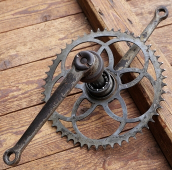 Tretlager ES-KA, für Tourenrad, orig. 30er Jahre, verchromt, Glockenlager, Kettenblatt 52 Zähne, Kurbellänge 170 mm, Durchmesser/Breite für Tretlagermuffe 41/78 mm, gebraucht, Zustand siehe Bilder.