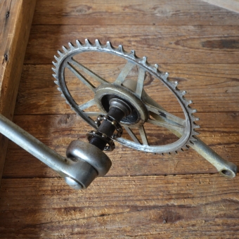 Tretlager Glockenausf. Achslänge 140 mm, Kurbellänge 172 mm, 50er Jahre. Hinweis zum Zustand: Die Tretlager sind unrestauriert, in der Substanz aber ok. Optik und Zustand der Zähne siehe Bilder. Die Konen und Lager müssen, soweit überhaupt dabei und je nach Anspruch an den technischen Zustand, ggf. überholt/ergänzt oder ausgetauscht werden. Ersatzteile können wir für viele Typen gegen Berechnung liefern.