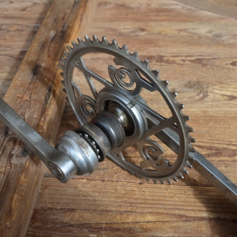 Tretlager 'Göricke' orig. 30er Jahre, verchromt, Lagerschalen 40 mm, gebraucht mit alterstypischen Gebrauchsspuren, siehe Bilder. Achslänge: 125 mm, Kurbellänge: 178 mm. Rares Originalteil für den passenden Klassiker mit 40 x 70 mm Standard-Tretlagergehäuse (ohne Schalen gemessen)