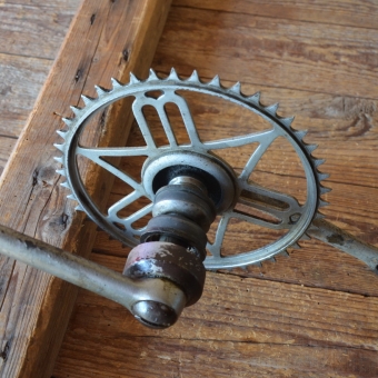 Tretlager "Meister" Achslänge 132 mm, Kurbellänge 170 mm, 50er Jahre. Hinweis zum Zustand: Die Tretlager sind unrestauriert, in der Substanz aber ok. Optik und Zustand der Zähne siehe Bilder. Die Konen und Lager müssen, soweit überhaupt dabei und je nach Anspruch an den technischen Zustand, ggf. überholt/ergänzt oder ausgetauscht werden. Ersatzteile können wir für viele Typen gegen Berechnung liefern.