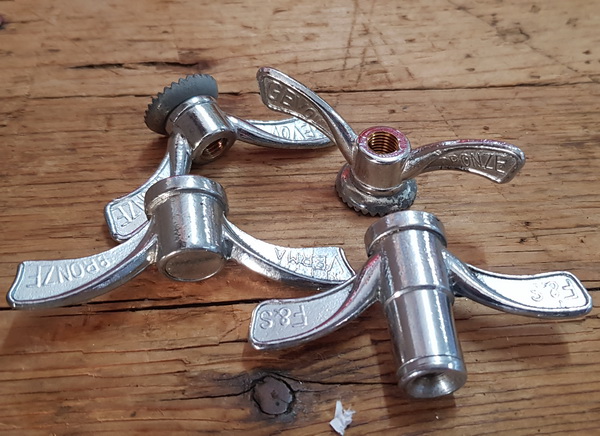 Flügelmutternsatz f. Dreigangnabe F&S Mod 55, Mod. 415/515 und 80er Jahre Modelle , orig. NOS. 2 x Hinterrad (Kettenleitmutter F&S gemarkt) , 2 x Vorderrad, sehr hochwertige Ausführung, verchromt