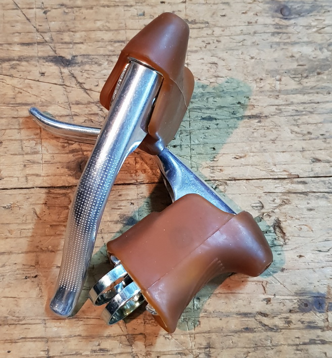 Bremshebel Satz ungemarkt, optisch wie frühe Weinmann / Altenburger Hebel, sie passen aber auch zu vielen anderen Modellen dieser Jahre. Gummiüberzug braun, orig. alte Neuware !
