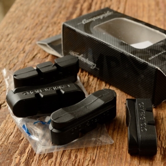 Bremsklötze "Campagnolo DELTA Record", orig. Satz 4 Stück, frisch aus kleiner Werksneuauflage ! Natürlich mit Schriftzug auf jedem Gummi.