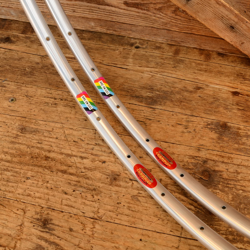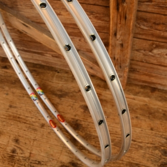 Felgensatz für Schlauchreifen "Super Champion Competition" "Arc en Ciel" 28 Zoll, Breite 20,4 mm, Lochzahl 28, Nippelbohrung 4,2 mm geöst. Oberfläche Alu hochglanz, Zustand: NOS
