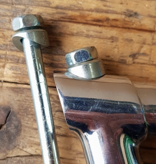 Lenkerklemmschraube "TITAN Belgien" mit spezieller U-Scheibe f. nach vorne abfallenden Rennvorbau,siehe Bilder. Orig. Altbestand NOS 60-70er Jahre, Länge=160mm, incl. Klemmkonus, SW=12 mm, gv.