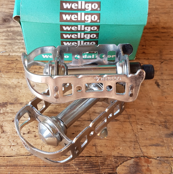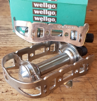 Pedale "WELLGO", Stahl, verchromt, für Straßenrenner, orig. 70/80er Jahre NOS/NIB