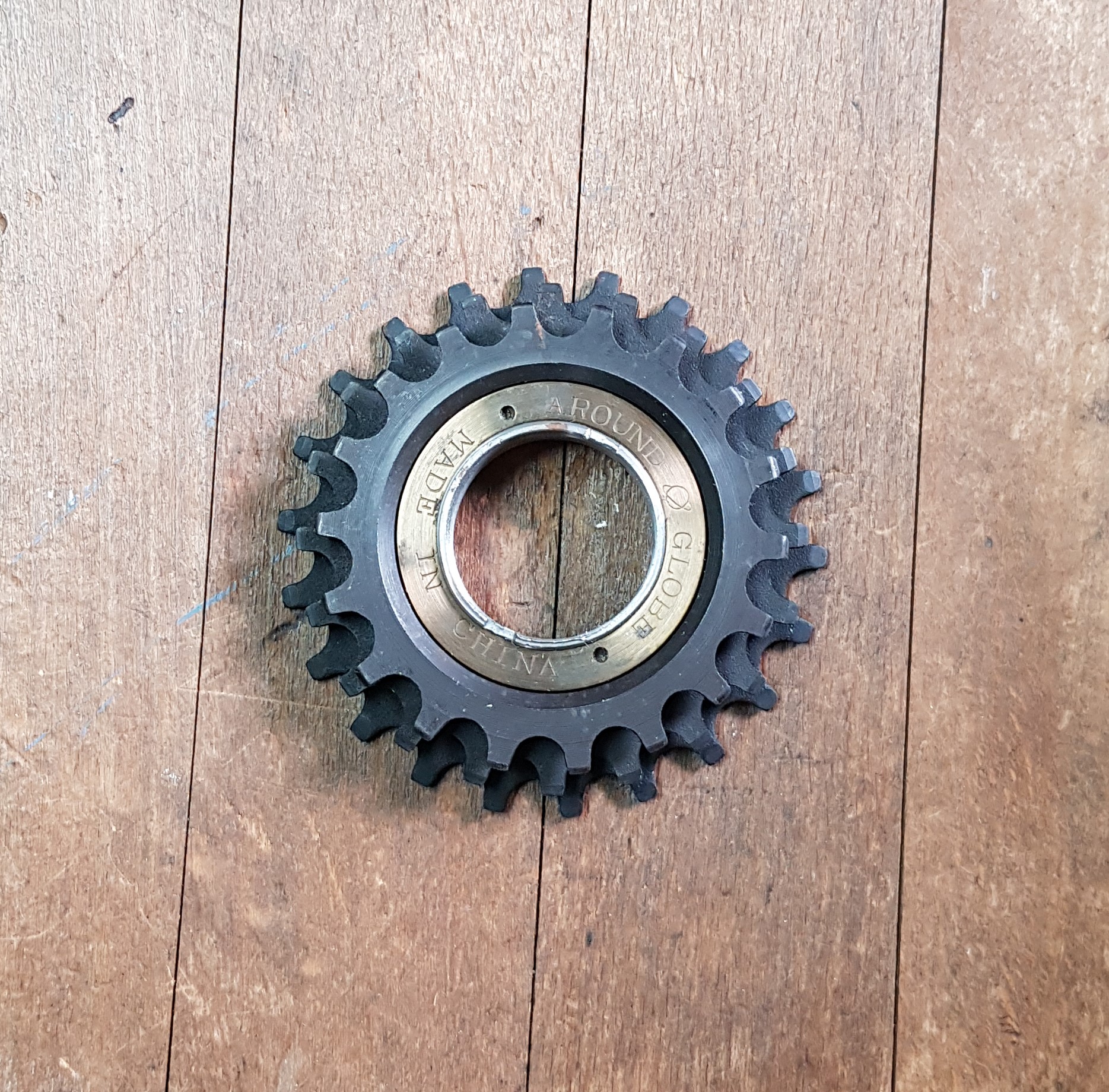 Freilaufkranz "Around Globe", 3-fach, 18-20-22, Standardgewinde ISO , NOS/NIB. Diese 1/2 x 1/8 Zahnkränze, für die frühen Kettenschaltungen mit "normaler" Tourenradkette, wurden bereits 1968 in CN mit alten deutschen Maschinen neu aufgelegt.